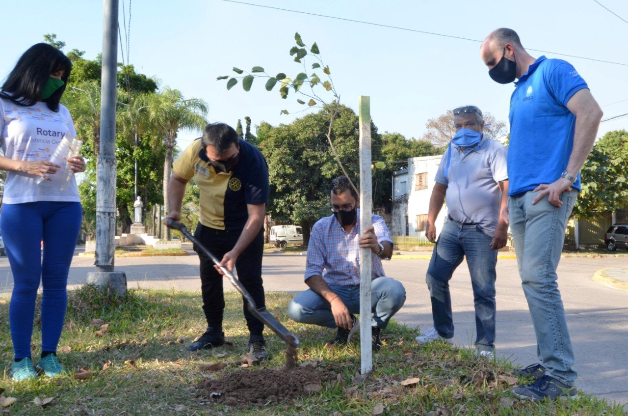 El Plan de Arbolado Urbano que se llevará a cabo en diferentes zonas de la Ciudad, con el padrinazgo ciudadano de las especies para incentivar el cuidado y compromiso ambiental en la comunidad. En esta oportunidad, por iniciativa del Rotary Club Resistencia Oeste, se colocaron plantines de falsa caoba, y lapachos en avenida Italia y calle Asunción; y de palo borracho, paraíso, y lapacho rosado en el cantero central de la avenida Sarmiento, entre otros.