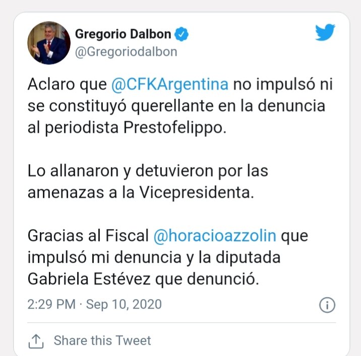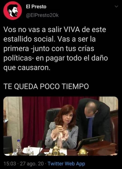 La primera denuncia la presentó Gregorio Dalbón, abogado de la vicepresidenta, quien denunció a título personal a Prestofelippo en el área de cibercrimen de la Justicia por los mensajes publicados en su perfil de Twitter. El joven youtuber vaticinó un “estallido social» en las próximas semana y aseguró que la ex primera mandataria no “va a salir” de ese caos. «Te queda poco tiempo», le juró.