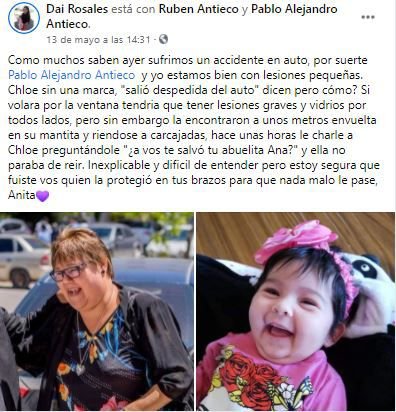 Dai Rosales, su mujer, también utilizó esa misma red social para contarle a sus amigos y familiares que todos ya fueron dados de alta. “Estamos bien, con lesiones pequeñas. Chloe sin una marca”, remarcó para llevar tranquilidad a sus seguidores. “A Chloe la encontraron a unos metros envuelta en su mantita y riéndose a carcajadas”, detalló aún asombrada por lo sucedido.