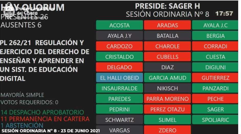 En la sesión ordinaria realizada este miércoles, la Legislatura sancionó el proyecto de Ley 262/21 que establece la “regulación y el ejercicio del derecho de enseñar y aprender en un Sistema de Educación Digital, en todo el territorio de la provincia del Chaco”
