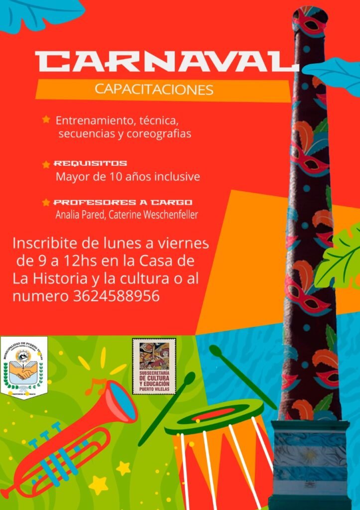 La Municipalidad de Puerto Vilelas conducida por el intendente Víctor Rea, a través de la Subsecretaría de Cultura y Educación invita y convoca a bailarines y bailarinas desde los 10 años (inclusive) a formar parte de las capacitaciones de carnaval gratuitas a través de entrenamiento de técnicas, secuencias y coreografías.