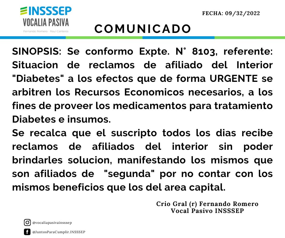 El Comisario General (R) Fernando Romero Vocal Pasivo Titular, ante reclamos por los afiliados del Interior «Diabetes» solicito de forma URGENTE se arbitren los Recursos Económicos necesarios, a los fines de proveer los medicamentos para tratamiento Diabetes e insumos.