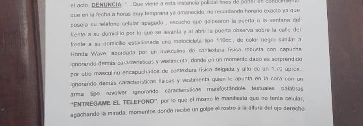 Esta vez de manera indirecta, Marcelo Acosta, realizó una nueva denuncia en la Comisaría Primera donde aseguró que llegaron dos personas a su domicilio a bordo de una motocicleta, le pidieron su celular y le dieron un golpe que lo dejó prácticamente inconsciente.