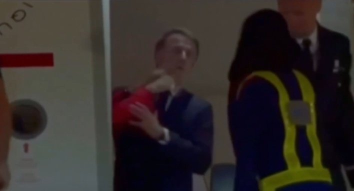 El momento quedó registrado justo cuando se abrió la puerta del avión presidencial francés y se mostró a Macron de pie en el interior. Desde el lado izquierdo de la puerta abierta, los brazos de su esposa, Brigitte, aparecen mientras ella coloca ambas manos sobre el rostro de su marido y gira suavemente su cabeza.