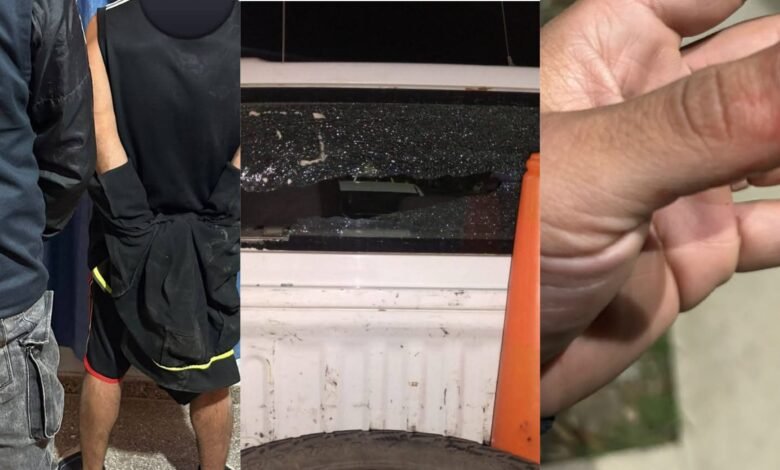 Durante la aprehensión, familiares del detenido intentaron liberarlo agrediendo al personal policial con golpes, patadas y proyectiles como ladrillos y botellas. Una de las piedras impactó en un patrullero, destrozando la luneta trasera y el espejo retrovisor derecho. Ante la violencia, se dispuso la retirada táctica para resguardar la integridad de los efectivos.