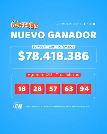 El sorteo de la Poceada Chaqueña de este martes 7 de octubre dejó un nuevo millonario en Tres Isletas. El premio total fue de $ 78.418.386.