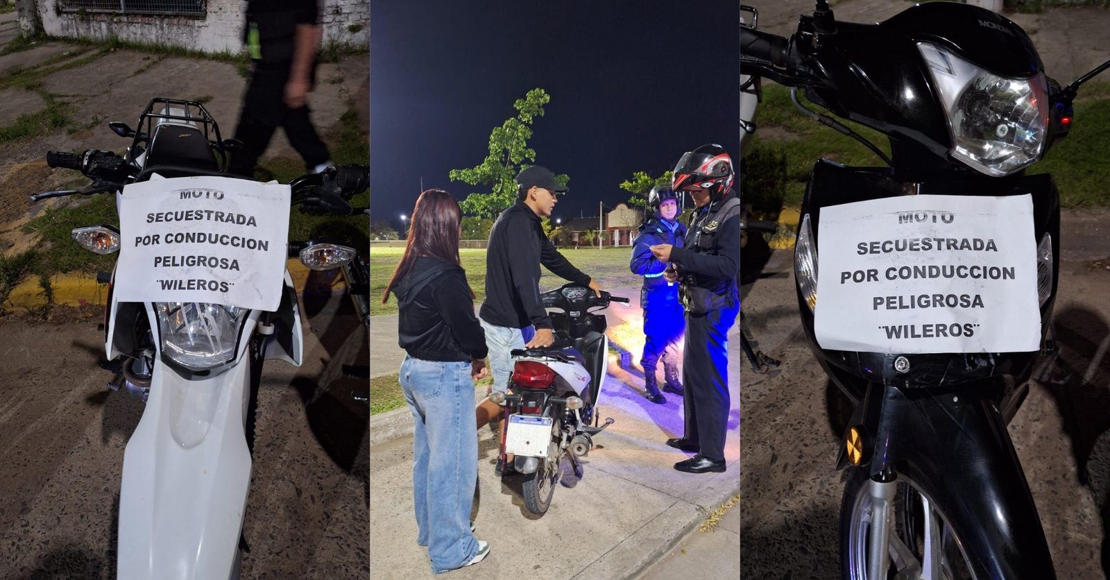 En la madrugada del sábado, se recibió una denuncia en la base de Tránsito sobre un grupo de cinco motociclistas que circulaban por la Plaza Paseo Sur realizando maniobras peligrosas —conocidas como “willy”— y utilizando escapes libres.