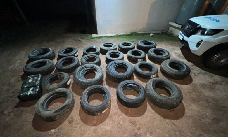 Cuando el vehículo fue inspeccionado, se encontraron 72 cubiertas nuevas, dos envoltorios con hojas de coca, 3.154 dólares, 422.420 pesos argentinos y un teléfono celular Samsung A15.