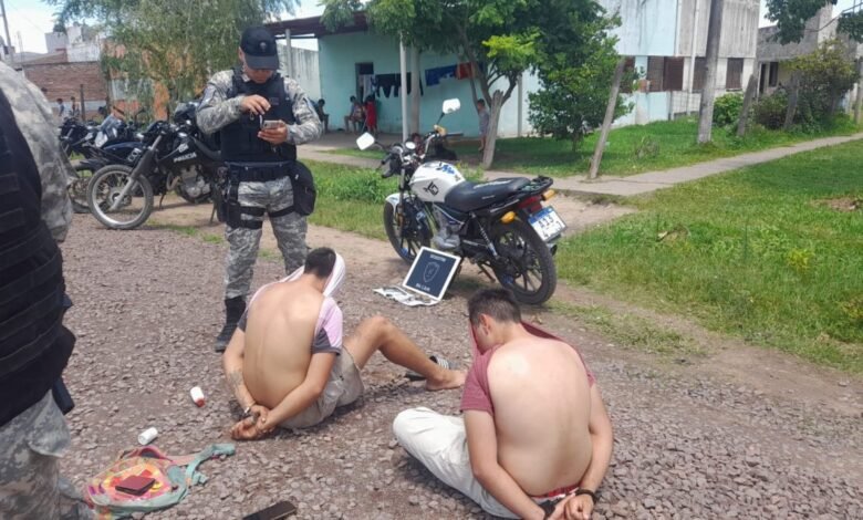 Pasadas las 11 los efectivos demoraron la marcha de una moto Motomel blanca y negra. En la que viajaban dos hombres de 22 y de 24 años quienes demostraron nerviosismo al momento de ser identificados, por lo que los agentes realizaron una palpación sobre sus prendas de vestir.