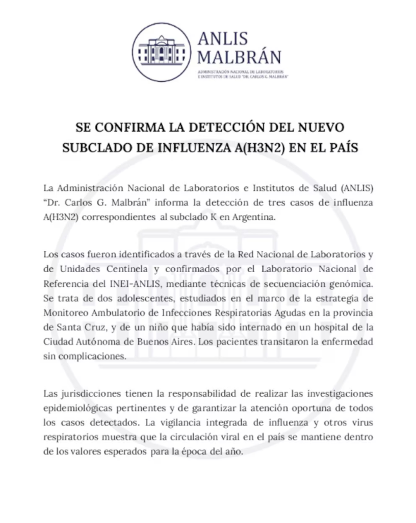 Según ANLIS “Dr. Carlos G. Malbrán”, la evidencia disponible hasta el momento no indica que este subclado cause cuadros clínicos más graves en comparación con otros virus de influenza A(H3N2) detectados en temporadas anteriores.