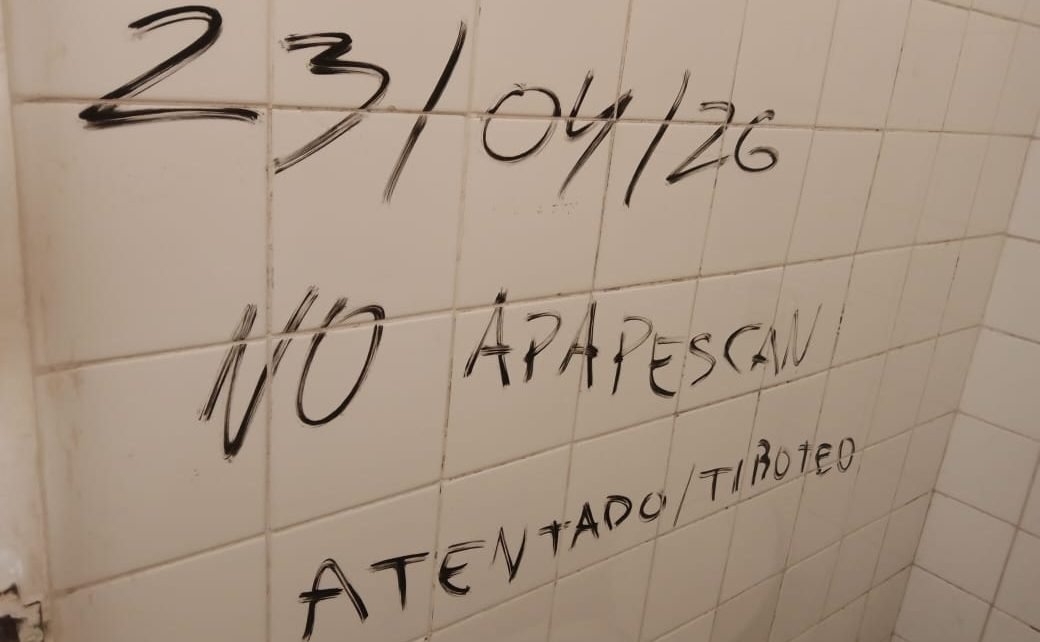 La situación fue advertida el jueves alrededor de las 19:30, cuando el directivo con 19 años en el cargo tomó conocimiento, a través de un alumno, de una inscripción en el baño de varones. El mensaje, escrito con tinta negra sobre los azulejos, decía: “17/04/26 tiroteo a la salida”, sin especificar el turno al que hacía referencia, en una institución que funciona en tres horarios.